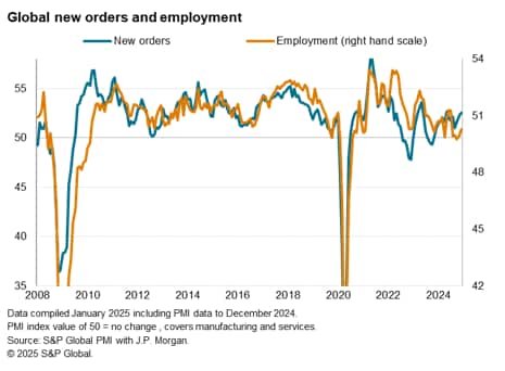 Improved inflows of new orders, which rose globally at the fastest rate for seven months, helped global private sector employment edge higher in December for the first time in five months. A marginal rise in service sector staffing offset a slight fall in factory payrolls.