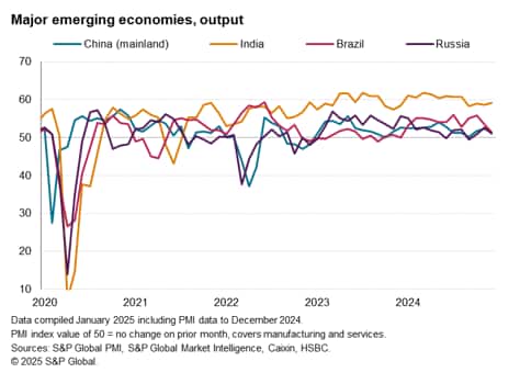 India once again led growth among the BRIC 'emerging' economies by a wide margin, as has been the case since July 2022, with growth picking up slightly in December amid sustained strong performances across both manufacturing and services.