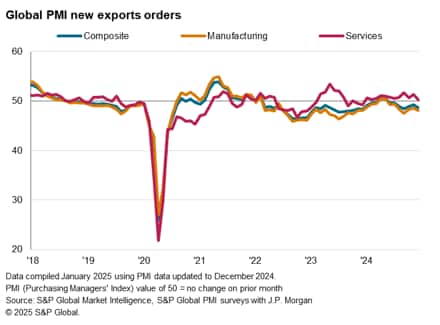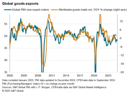 The worldwide Purchasing Managers' Index (PMI) surveys compiled by S&P Global Market Intelligence indicated that the contraction of global trade deepened at the end of 2024. This was attributable mainly to softening goods trade, though the exchange of services also came close to stalling in the closing month of the year.