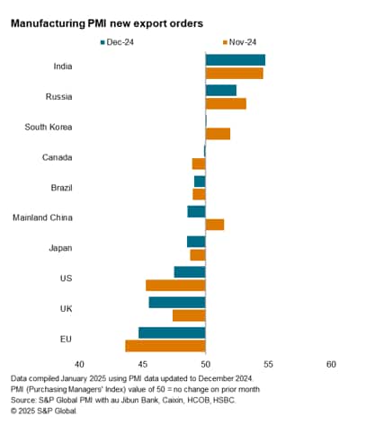 Three of the top ten trading economies recorded higher goods export in December, down from four in November, as mainland China's goods export orders declined after rising at the fastest pace in seven months in November. India led with the fastest expansion of goods export orders at the end of 2024, the rate of growth accelerating to a five-month high amid reports of greater ease in securing orders from across the globe. This was despite the wider India manufacturing sector posting the weakest growth rate of 2024. Russia and South Korea followed, albeit with the rates of manufacturing export orders growth slowing from November in both cases, the latter near-stalling at the end of the year.