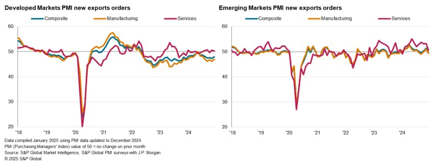While the reduction in export orders was concentrated among developed economies earlier in the fourth quarter, December saw both emerging and developed markets receiving lower new orders from abroad. In line with the abovementioned fading of front-loaded purchases ahead of potential US tariffs, emerging markets saw export orders decline in December after rising at the quickest pace in six months during November. The pace at which export orders fell among emerging markets was marginal, however, and was limited to the manufacturing sector.