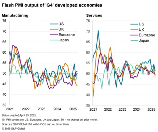 The Composite PMI Output Index from the G4 economies, a GDP-weighted gauge covering both goods and services, fell from 52.2 in March to 50.7 in April, according to the preliminary 'flash' reading. While the latest reading signalled an ongoing expansion of output, the rate of growth signalled was the weakest since December 2023.