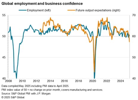 But business confidence deteriorated elsewhere, and most markedly in the UK - where new employer taxes came into effect in April - and in mainland China - where US tariffs were hiked sharply. However, confidence notably also fell sharply in the US and eurozone, with even India not left unscathed by the rise in global economic uncertainty.