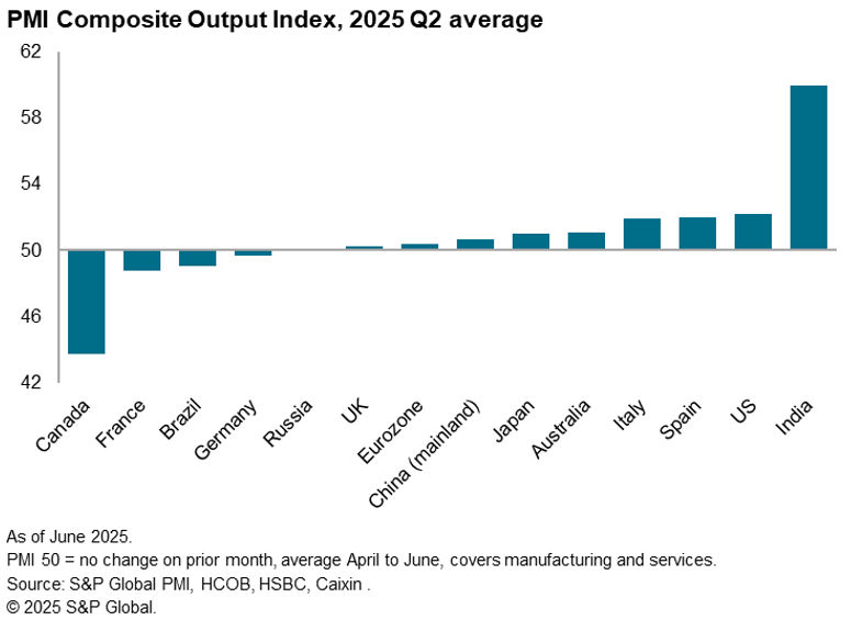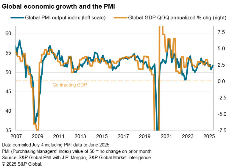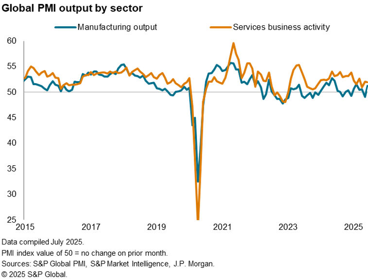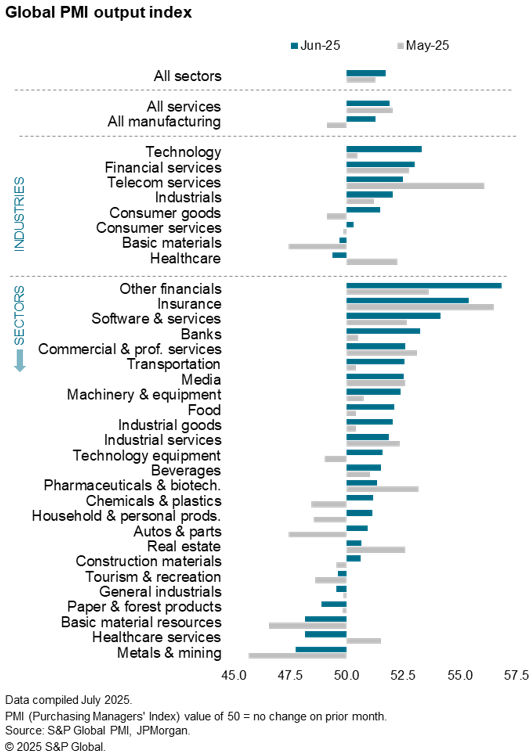 The headline Global PMI, covering output in manufacturing and services across over 40 economies and compiled for J.P. Morgan by S&P Global, rose from 51.2 in May to 51.7 in June. The rise signalled the fastest pace of expansion since March. However, despite the further upturn, the average expansion signalled by the PMI over the second quarter has been the weakest since the fourth quarter of 2023.