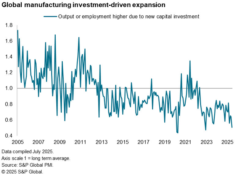 Another warning sign on investment spending was a deterioration in the number of manufacturers on the global PMI survey reporting that output or employment had risen in response to new capital investment. This investment-led expansion is now running at one of the lowest levels seen in the 20-year history of the data series.