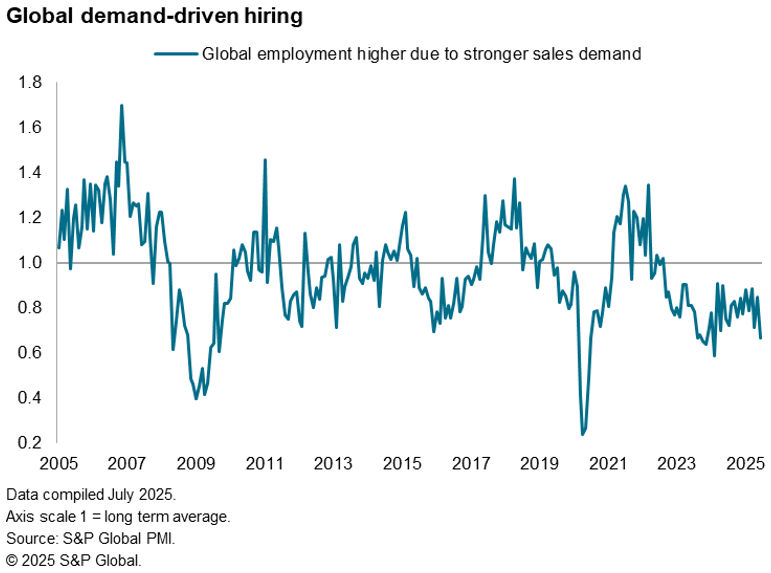 The monthly PMI surveys also highlight how weak demand conditions have curbed firms’ appetites to hire new staff to a degree only usually seen at times of heightened global economic stress.