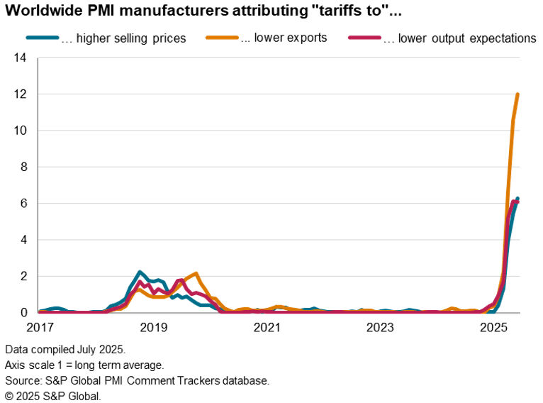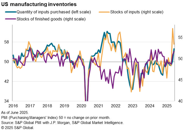 Although encouraging at first glance, survey respondents note that this higher factory growth was in part buoyed by the front-running of US tariffs. Seeking to get ahead of the 9th July tariff deadline, greater exports were shipped to the US, a consequence of which was a second month of intense inventory building by US firms. Stocks of inputs held by US manufacturing rose by an unprecedented degree in May, followed by another month of strong growth in June. Global manufacturing output growth looks set to weaken when this trade reverses: US factories (and likely retailers, too) will now be holding excess stock, reducing their imports.
