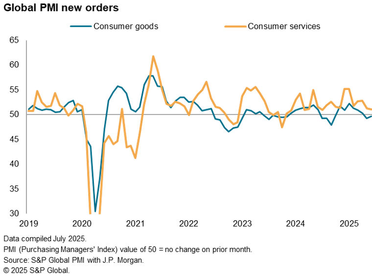 Measured globally, consumer services activity in the past two months has been the weakest since late 2023, contracting marginally in both the US and Europe in June, on the back of weaker demand growth. New orders for consumer goods have meanwhile fallen over the past two months, dropping in Asia and Europe to offset a rise in the US.