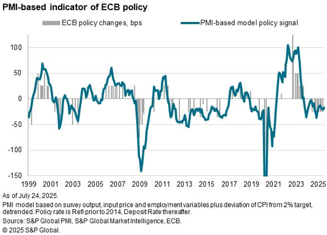 A composite indicator, based on key PMI gauges and the extent to which inflation is deviating from the ECB’s 2% target, remains in rate-cutting territory, reflecting the overall weakness of output growth, the cooler inflation picture, and a largely stalled labour market. July’s flash PMI indicated another mere marginal rise in eurozone employment for a fifth successive month after seven months of decline.