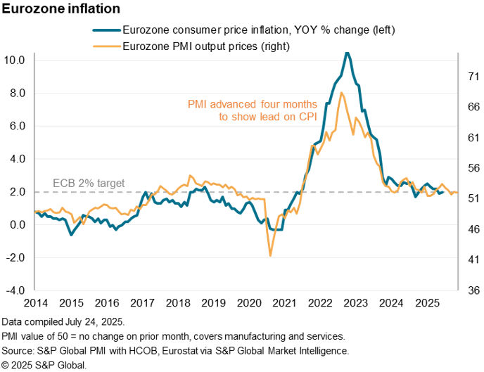 Inflation pressures meanwhile remained subdued in July by recent standards. Average prices charged for goods and services across the eurozone rose only modestly, the rate of inflation unchanged on June and only slightly above the survey’s long run average. Historical comparisons indicate that this PMI prices charged gauges is roughly indicative of eurozone consumer price inflation holding at the ECB’s target 2% rate.