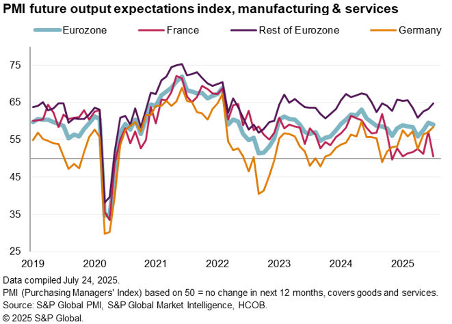 Survey responses suggest that at least some of this improvement to German exports in particular reflects the front-running of US tariffs, which is therefore likely providing only a temporary boost to manufacturing performance. However, it is encouraging to see business expectations about output in the year ahead continuing to run at one of the highest levels seen over the past year on a pan-eurozone basis and that, bar France (where confidence fell back sharply in July, likely linked to domestic political issues raising the specter of austerity), confidence improved further in July. Future prospects are notably among the highest for three years in Germany, led by resurgent optimism in the services economy.