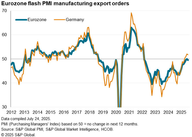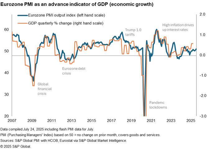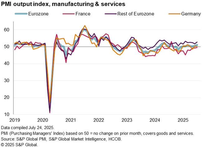 The flash PMI® survey data for July indicated that eurozone business activity rose at a slightly faster rate at the start of the third quarter, albeit still indicative of just 0.2% GDP growth. Worryingly, some of this growth likely reflects a temporary boost from the ongoing front-running of US tariffs. Absent any EU-US trade deal, an August 1st deadline looms after which US tariffs are scheduled to rise sharply.