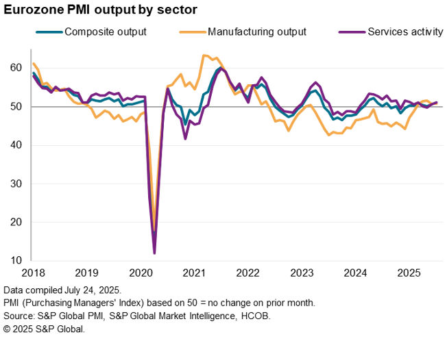 Eurozone business activity grew at an increased – but still sluggish – rate in July, according to provisional PMI survey data. The seasonally adjusted HCOB Flash Eurozone Composite PMI Output Index, based on approximately 85% of usual survey responses and compiled by S&P Global, rose to 51.0 in July from 50.6 in June.