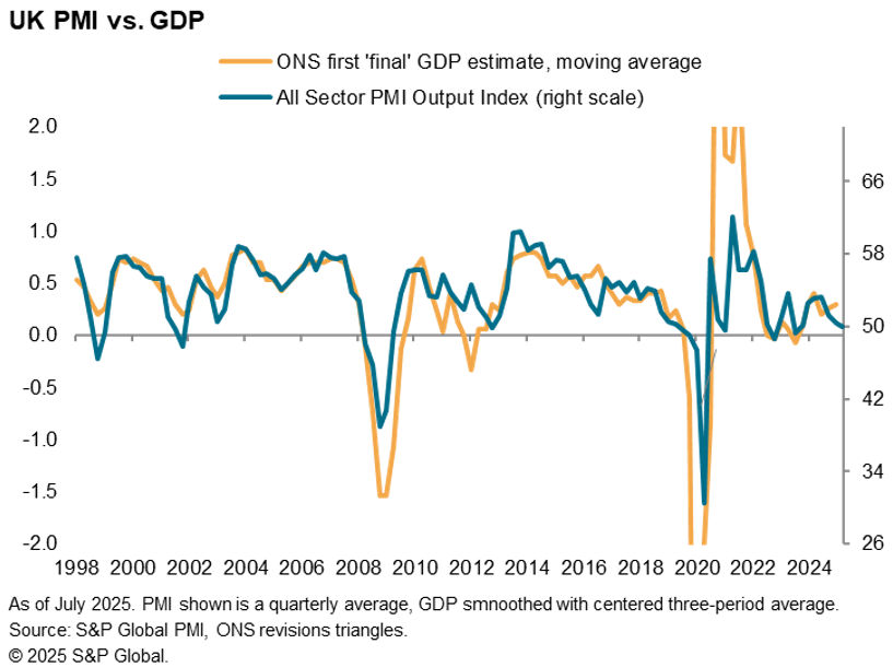 • The deterioration in the economy is linked to last autumn’s Budget, alongside geopolitical tensions, but PMI sentiment indicators suggest that concerns over tariffs appear to be easing.