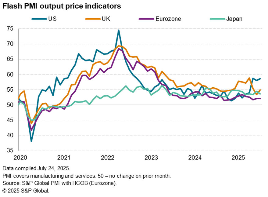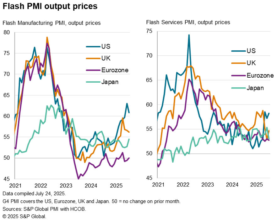 While the US led the economic upturn across the G4 in July, it also again reported the highest price pressures. Average prices charged for goods and services in the US rose at a rate just short of May’s recent 32-month peak, with firms across both manufacturing and services first and foremost blaming the need to pass higher tariff-related costs onto customers.