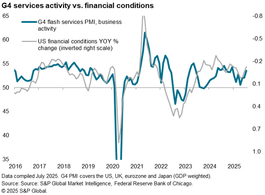 Despite the cooler expansion seen in the UK, the overall growth rate of service sector activity across the G4 accelerated in July to the fastest since December. It is likely that this in part reflects improving financial conditions, with recent stock market gains and, in many cases lower, lower inflation rates helping fuel more activity.