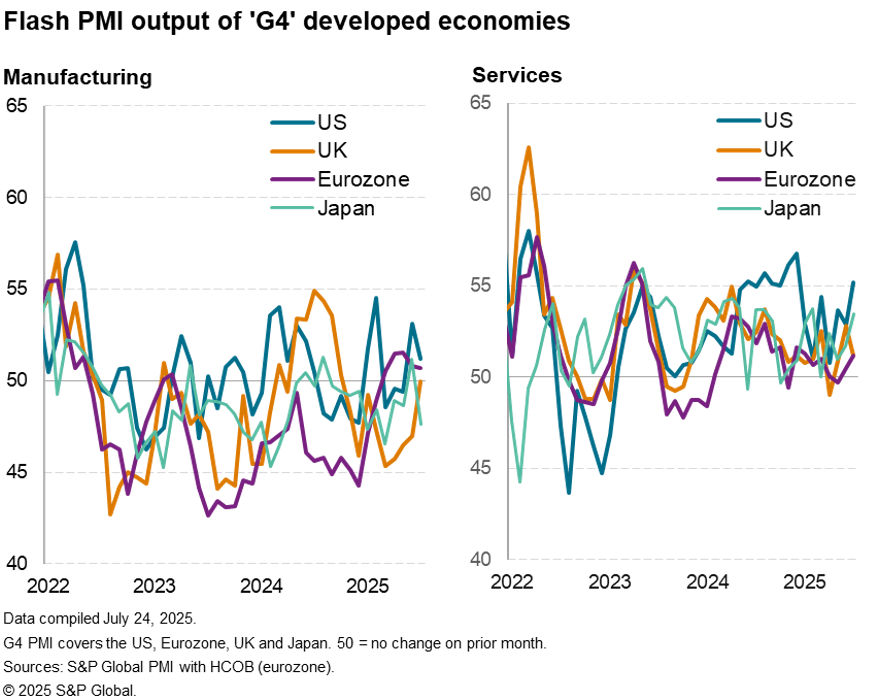 While the US flash PMI composite output index (covering manufacturing and services) rose to 54.6 at the start of the third quarter, reaching its highest so far this year and one of the highest levels recorded over the past three years, far lower readings were seen elsewhere. The equivalent PMI index for Japan registered 51.5 while the eurozone and UK equivalents both registered 51.0, indicating especially modest economic growth.