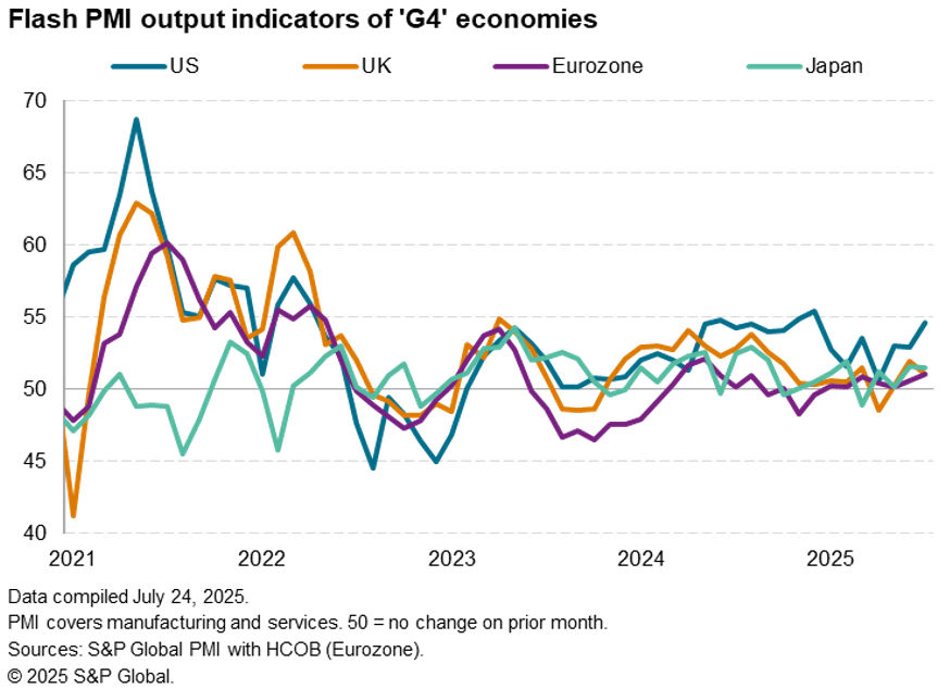 The US once again reported the fastest growth of output of the G4 economies in July, according to early PMI data, outpacing the other major developed economies for the thirteenth time in the past 15 months and to the greatest extent since January.