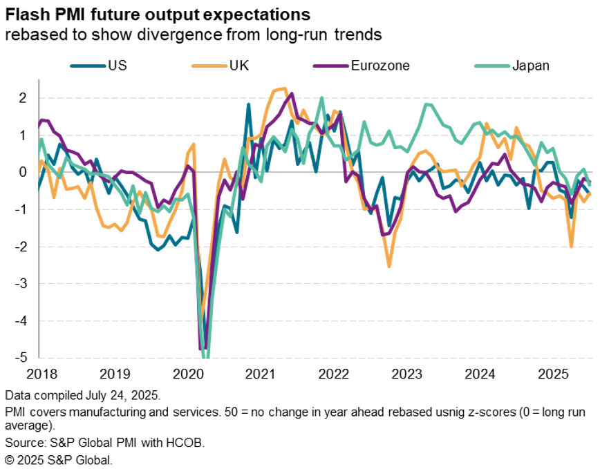 Inflation worries quelled business optimism about the year ahead in the US, pushing growth expectations further below their long run average to a greater degree than witnessed in the other G4 economies. Only the UK in fact saw businesses grow slightly more confident in July, leading the G4, albeit improving from a low base. Sentiment around the world continued to be subdued in particular by concerns over the destabilizing effect of changing US trade policy.