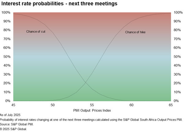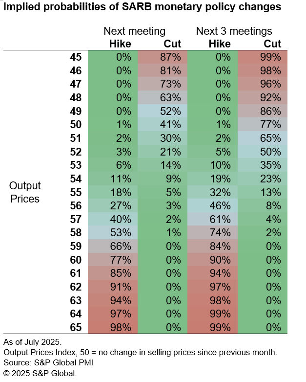 These statistical findings can be demonstrated using the chart below, which shows the likelihood of tightening and loosening at different levels of the Output Prices Index using the 2011-2025 sample. For example, if the Output Prices Index were to record 60.0, which is roughly consistent with South Africa CPI reaching 7% year-on-year, the model implies a 77% chance the SARB will raise interest rates at the next meeting. If the Output Prices Index recorded 48.0, which is below the 50.0 neutral mark and thereby signals falling selling prices at private sector companies, the model implies a 63% chance of interest rates decreasing at the next meeting.