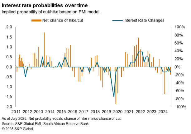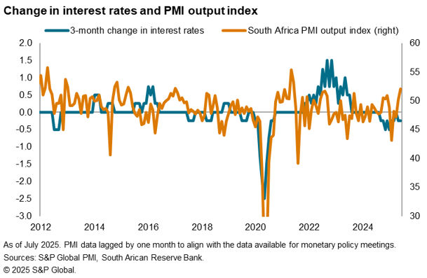 When we modelled SARB decisions using the 2011-2025 sample, we therefore found changes in output and prices can both trigger changes in interest rates, but prices typically take precedence. Moreover, the PMI Output Index was only significant at the 10% level, and when modelling using a sample cut of 2017-2025, the PMI Output Index was no longer significant. However, employing a dummy variable that accounts for periods of heightened recession risk (calculated as when the output index was more than 1 standard deviation below its mean) helped to improve the modelling of interest rate cuts. This chimes with our previous research that explored the use of PMI data in predicting monetary policy in major developed markets, which found that output was often a key driver of interest rate decisions, particularly when interest rates are loosened.