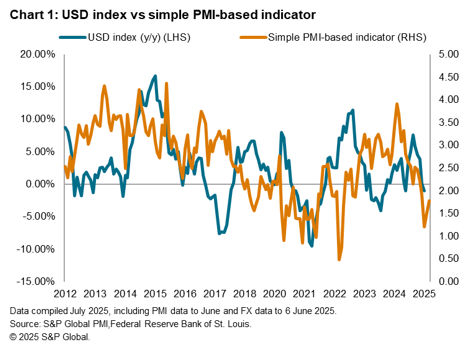 Through a simple linear regression based on the two variables, we estimate the expected year-on-year change for the US dollar index according to the PMI signals of economic growth and uncertainty-driven safe haven status, choosing to go long if the index has yet to reach the target and vice versa. For simplicity, each trade is held for the entirety of the month until the next trade is placed, which means it may overshoot target or be closed out at a loss even if the target was achieved in the month. Through back testing over the period from May 2012 to May 2025, we observe a win rate of around 55% using this simple PMI-based indicator.