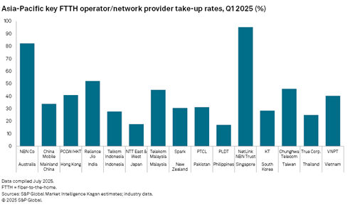 Fiber broadband revolution in the Asia-Pacific region continues through various nationwide fiber backbone projects and leading internet service providers investing heavily in the expansion of fiber-optic infrastructure. As of year-end 2024, fiber broadband has become the dominant fixed broadband technology across most Asia-Pacific markets, with about 577.4 million connected households and an 87.4% share of fixed broadband subscriber base, driving significant improvements in internet speeds, reliability and digital advancements. Though despite the extensive network reach, actual household take-up rates of fiber broadband services remain below 50% in most Asia-Pacific markets as of the first quarter of 2025, according to S&P Global Market Intelligence Kagan.