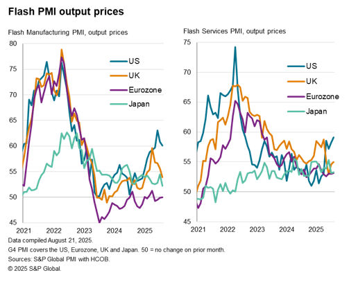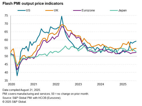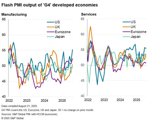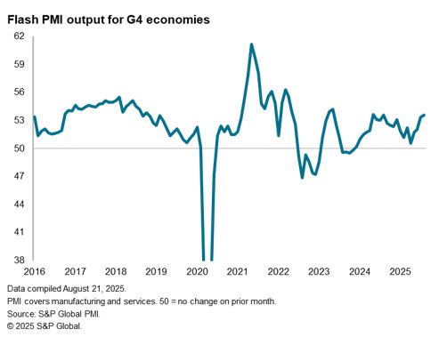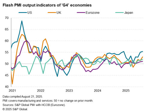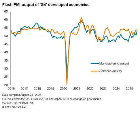 At 53.6, up from 53.3 in July, the flash PMI output index for the ‘G4’ major developed economies (the US, eurozone, Japan and the UK) signalled that the pace of expansion has accelerated continually since hitting a 16-month low back in April, when uncertainty caused by US tariff policy announcements caused output growth to come close to stalling. Since then, output growth has improved steadily such that August’s rise was the strongest for a year, and the joint-highest recorded since May 2023.