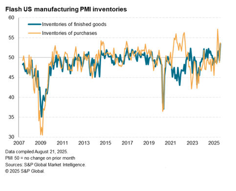 US inventories of finished goods showed the sharpest rise recorded since the survey data were first available in 2007, while inventories of purchased inputs rose to a degree beaten over the past three years only by May’s tariff-related surge.