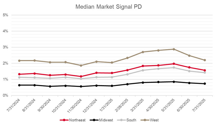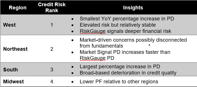The West, despite having the highest PDs, experienced the smallest percentage increase, suggesting relative stability in an otherwise risk-heavy environment. In the Northeast[AL1] , the Market Signal PD rose much faster than the RiskGauge PD, hinting at market-driven concerns possibly disconnected from the underlying financial fundamentals.
