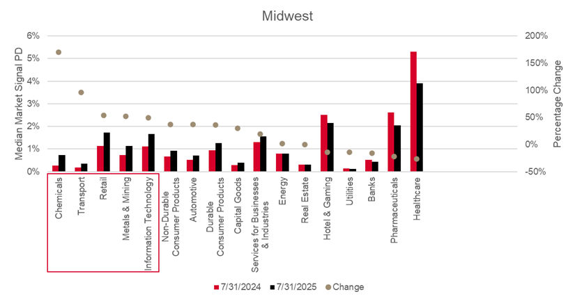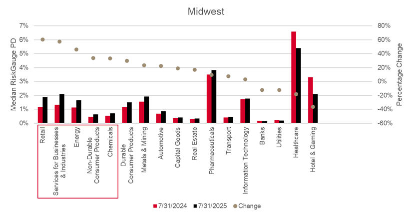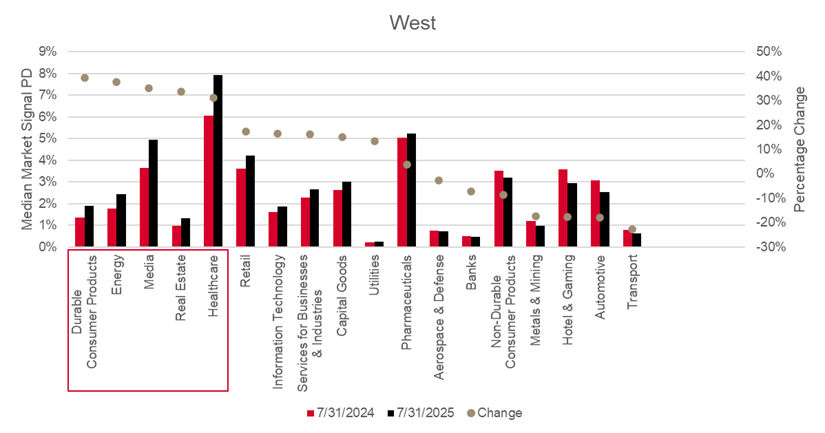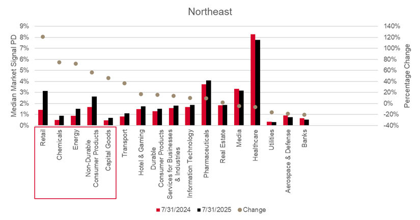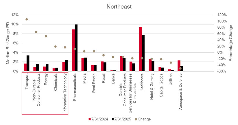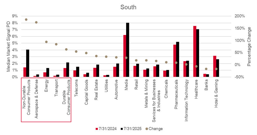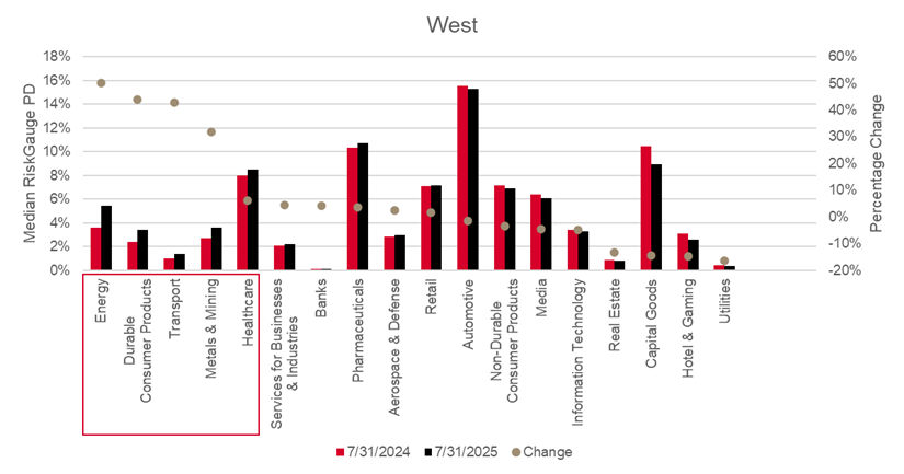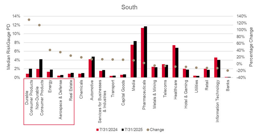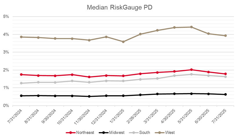 Interestingly, RiskGauge PDs were notably higher than Market Signal PDs in the West, indicating heightened financial or business risk factors that may not be immediately reflected in market sentiment. In contrast, the South showed the largest year-over-year increase in PD, highlighting a broad-based deterioration in credit quality.