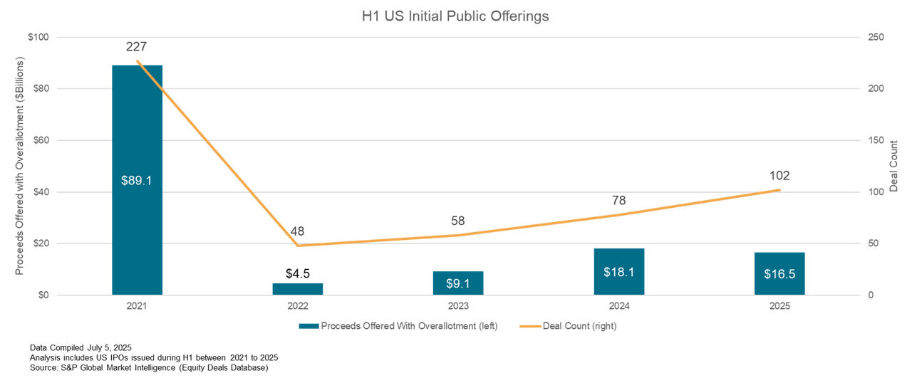 It is encouraging to point out that U.S. IPO volumes doubled each first half of the year from 2022 until 2024. That trend stopped in H1 2025, with volumes down 9% versus the first half of last year.