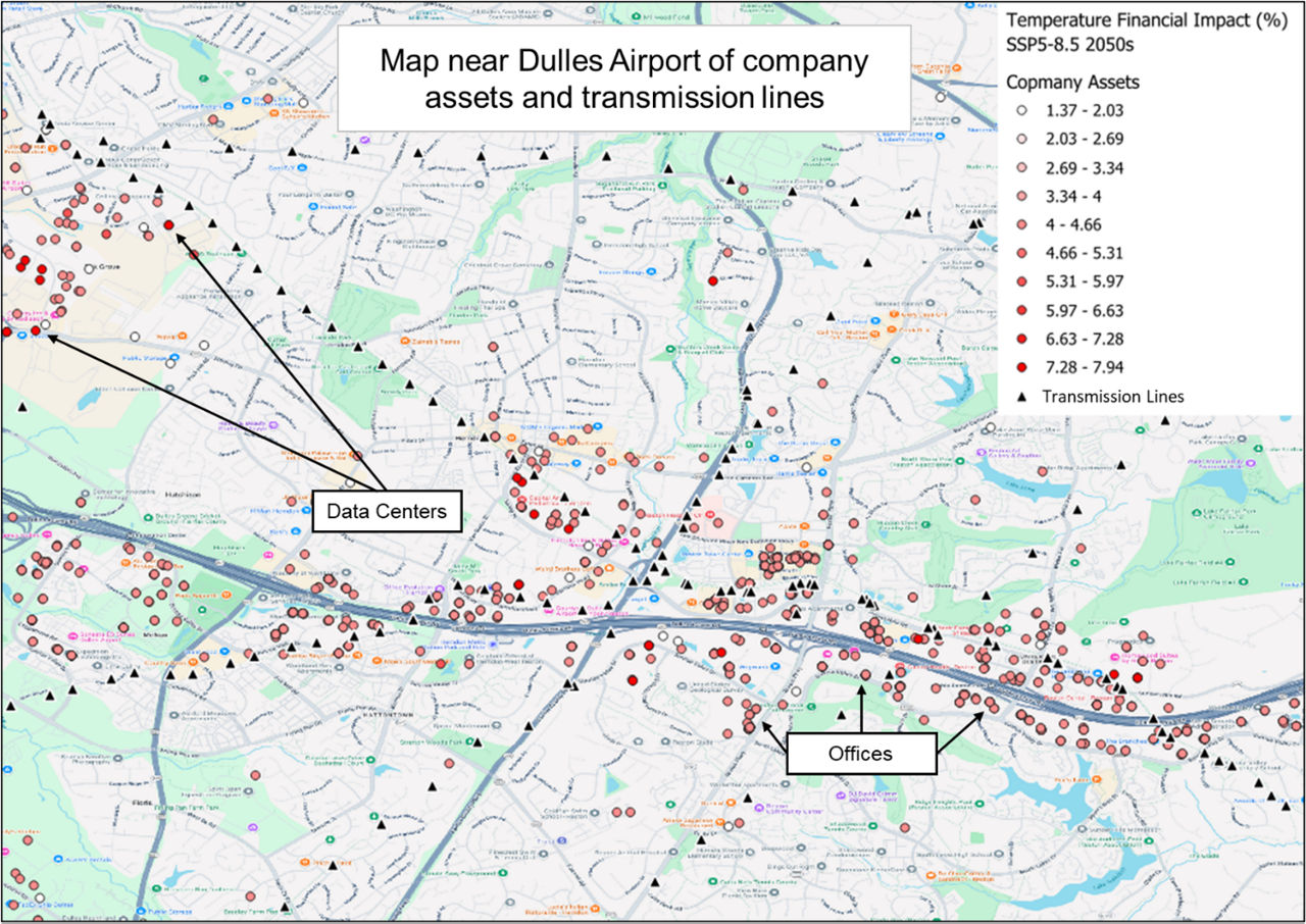At a granular level, you can gain insights on company's physical asset locations and our known grid assets to supplement your existing scoping and risk analysis process. Here’s we’re displaying corporate assets and transmission lines near Dulles airport outside of Washington, DC. The red shading indicates the level of composite financial impact in the 2050s under SSP5-8.5. Data centers show a higher financial impact than the surrounding offices due to their cooling needs and susceptibility to temperature and drought.