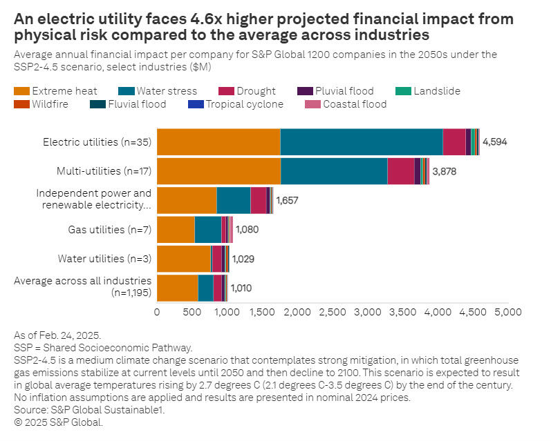 According to our analysis, by 2050, electric utilities face a 4.6x higher financial impact than other sectors—driven largely by heat and water stress.