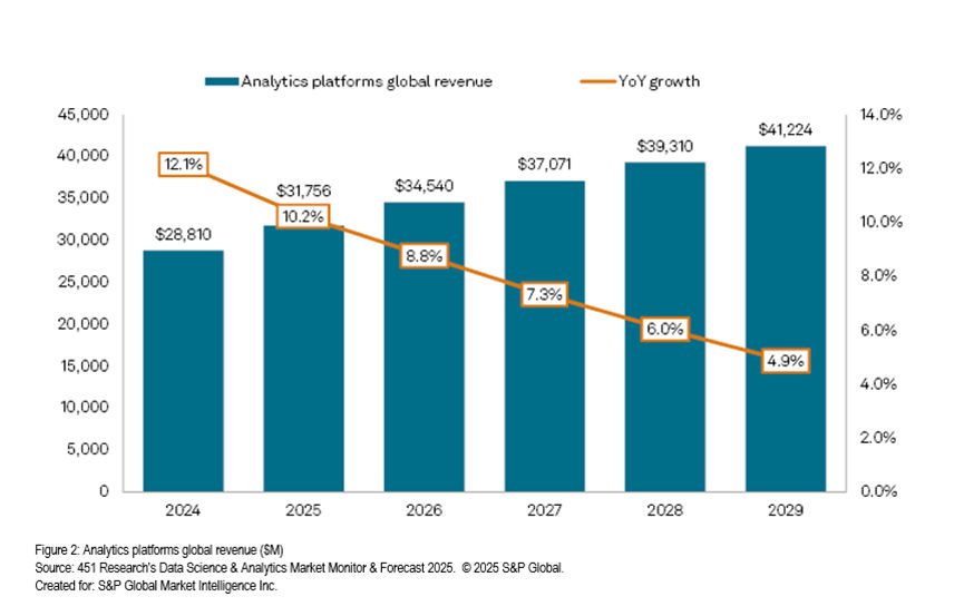 451 Research's latest market sizing and forecast update highlights the size, competitive dynamics and expected growth for the data science and analytics market, as well as its two components: data science platforms and analytics platforms. We expect the analytics platforms market to increase at a compound annual growth rate of 7.4% to reach over $41 billion in 2029. Our market forecast is generated from a bottom-up analysis of 65 vendors.