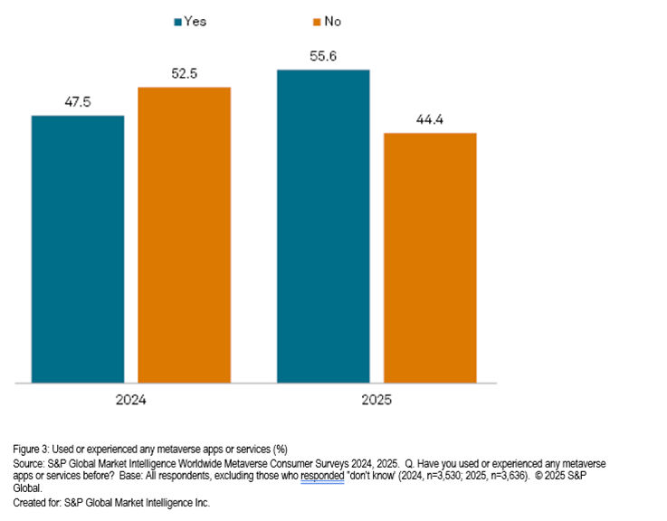 Comparing survey results year over year portrays a warming market for the consumer metaverse: A relatively steady rate of respondents making transactions, a slightly more positive outlook on the presence of display ads, and significant amelioration of concerns around payments, security and privacy. These factors set the stage for continued user and revenue growth for top metaverse-leaning operations, such as Minecraft, Roblox and Fortnite. However, it may be harder for smaller, emerging players to break through. The percentage of adults who reported using metaverse apps or experiences grew by 8 percentage points to nearly 56% in S&P Global Market Intelligence's 2025 Worldwide Consumer Metaverse Survey compared with the survey fielded a year ago — an increase that underlines the growing role virtual spaces are playing in our day-to-day lives.