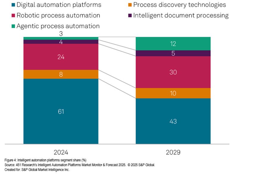 S&P Global Market Intelligence 451 Research's Intelligent Automation Platforms Market Monitor & Forecast report estimates that the market for intelligent automation platforms (unified platforms equipped with capabilities that can include business and robotic process automation, process discovery, intelligent document processing and emerging agentic process automation) has surpassed $26 billion in revenue as of 2024, with projections indicating it will exceed $62 billion by 2029, reflecting a compound annual growth rate (CAGR) of 19.1%. This growth is particularly evident in the agentic process automation segment, which is forecast to grow at an impressive CAGR of 62.7%.