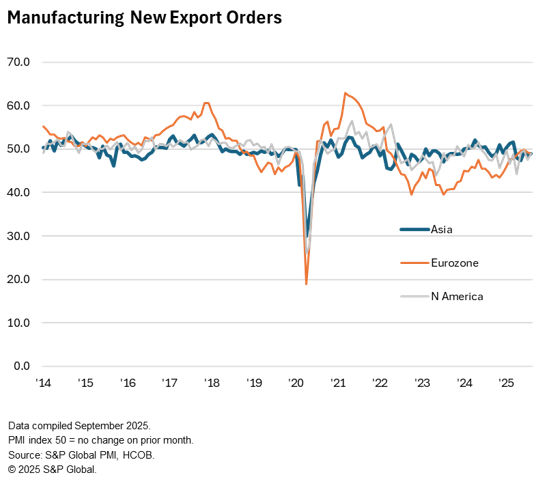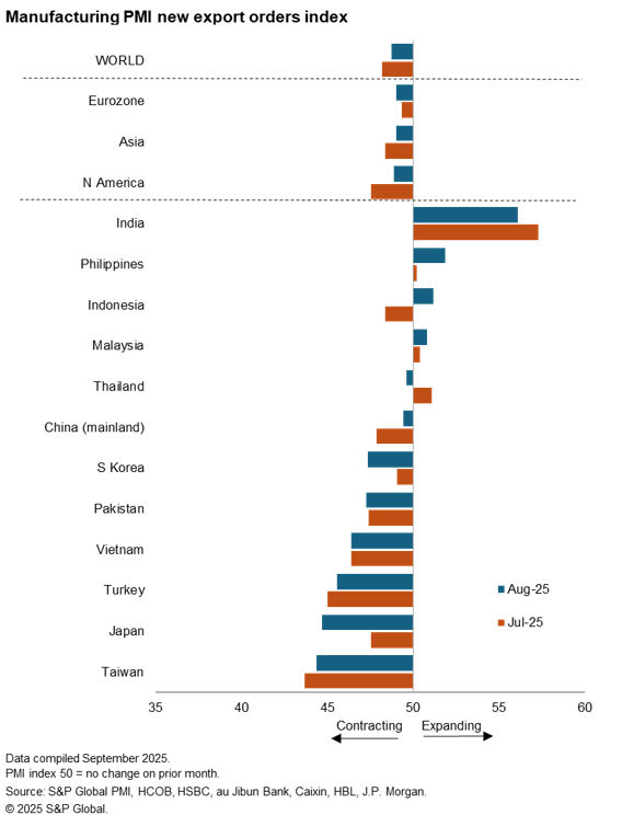 Global goods producers reported a fifth consecutive monthly decrease in export orders in August, the decline dating back to the initial bout of tariff announcements in April. However, while the rate of decline remained only modest, and broadly similar across North America, the Eurozone and Asia, the latter saw divergent trends across the region, ranging from steep export declines in Taiwan and Japan to rising exports in India and the Philippines.
