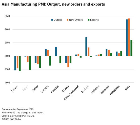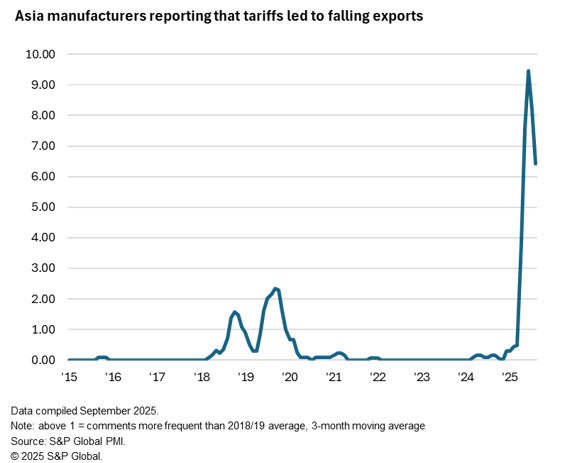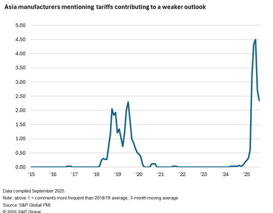 As the global trade environment has continued to adjust to frequent changes in US tariff policy, anecdotal evidence provided by manufacturing firms responding to PMI surveys across Asia often indicated that tariffs continued to be cited as a key factor hindering export demand.