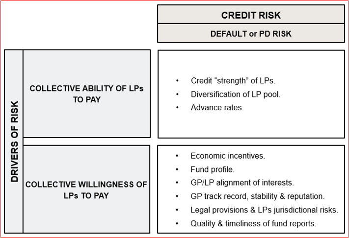 Figure 1 (below) captures the key PD (or default) risk factors for capital call facilities. On the vertical we split drivers into two groups. First impacting the ability of LPs to pay and the second impacting their willingness to answer capital calls.