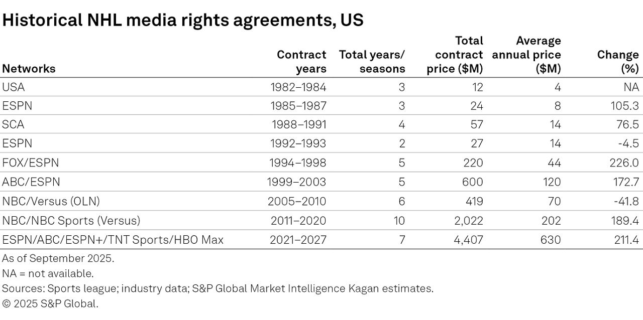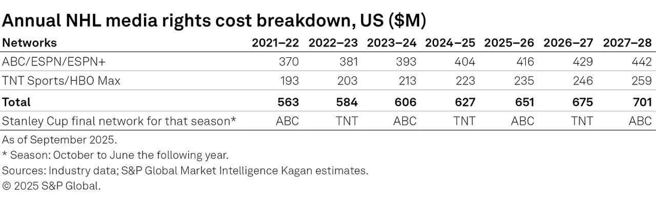 The NHL is in the fifth year of its lucrative media rights agreements with Walt Disney Co. and Warner Bros. Discovery Inc. (WBD), valued at nearly $4.5 billion over seven years. These agreements have more than doubled the value of previous contracts, with Disney contributing over $400 million each year to showcase games on platforms like ESPN, ABC, ESPN+, and Hulu. This season, ABC will host the Stanley Cup Final for the third time under this deal, while WBD will air games on TNT and HBO Max, investing approximately $225 million annually.