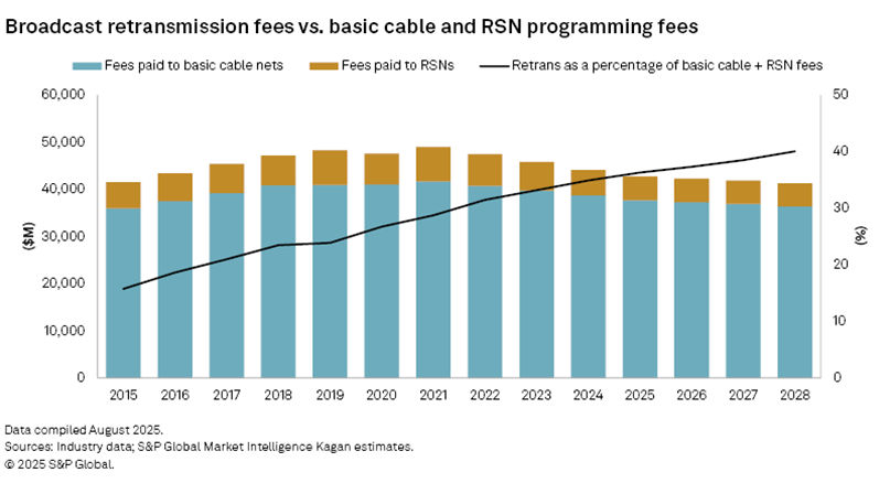 Based on Kagan estimates, by 2028, the projected $16.54 billion in gross retransmission and virtual subscriber fee revenue will represent 40.1% of the $41.30 billion that we model multichannel operators will pay to basic cable networks and regional sports networks that year. This occurs despite the higher TV viewing share for the Big Four broadcast networks, highlighting the pricing power differential between broadcast and cable programming.