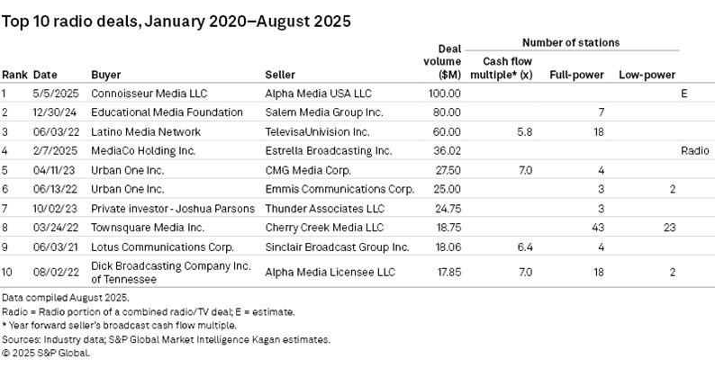 Including all announced broadcast station deals year-to-date through the end of August, total TV station deal volume reached $6.91 billion at an average two-year forward cash flow multiple of 7.6x, while radio station sales totaled $196.3 million at an average forward cash flow multiple of 6.3x.