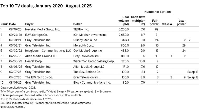 The TV deal market has been quick to take advantage of the prospects of softening or outright removal of broadcast ownership caps, with a slew of station deals and mergers being announced in July and August, including the Gray Media Inc. and The E.W. Scripps Co. station swaps and Nexstar Media Group Inc.'s announced $6.2 billion deal for TEGNA Inc.