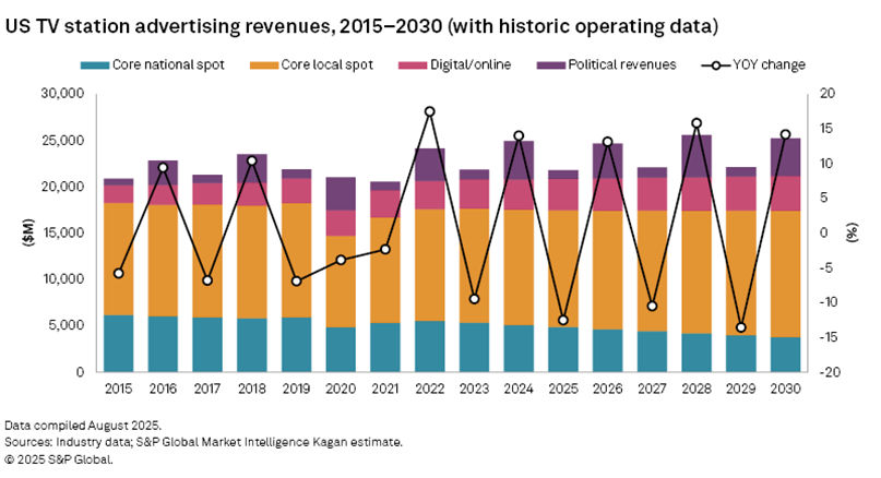 Over the next five years, TV station ad revenue is projected to grow at a 1.5% compound annual growth rate (CAGR), peaking at $25.58 billion in 2028 before declining by 13.6% to $22.11 billion in the non-election year of 2029, and then rebounding by 14.2% to $25.25 billion in 2030. This five-year CAGR is higher than the 2024 outlook, reflecting the cycle starting in a nonpolitical, non-Olympic year in 2025 and ending in a mid-term and Olympic year in 2030. Throughout the 2025–2030 period, the core national spot ad market for TV station owners is expected to decline at a 4.9% CAGR, whereas local spot revenue is projected to increase at a 1.5% CAGR. The fluctuations in political ad spending during election years are expected to create significant variations in total TV station ad revenue.