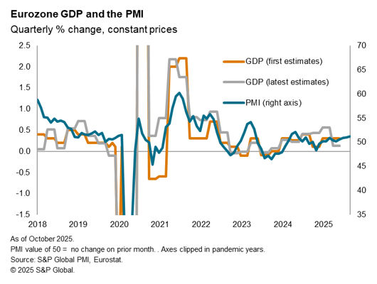 In the eurozone, the quarterly averages of the PMI data also correlate slightly more closely with the first estimates of GDP (83%) than with the latest GDP estimates (82%) in the pre-pandemic years (measured since 2003, when GDP first estimates became available), but it is clear that the PMI has avoided the under-estimation of growth often seen in the first estimates, notably in the decade prior to the pandemic. This corresponds with ECB research which found that “PMI surveys are not only valuable for analysts and policymakers as a timely and reliable GDP tracker, but also for statisticians to potentially improve the accuracy of the first preliminary flash estimate of euro area real GDP.”