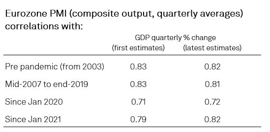 In the Eurozone, at 82%, the correlation of the quarterly average of the PMI all sector output index against the latest estimates of GDP since January 2021 matches the pre-pandemic long-run correlation, albeit with the correlation dropping to 72% if the main pandemic year of 2020 is included.
