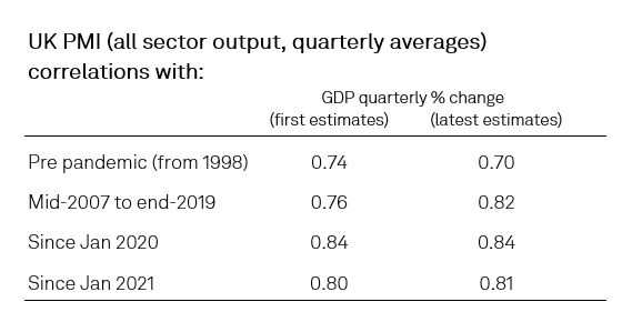 In the UK, at 84%, the correlation of the quarterly average of the PMI all sector output index against both first and latest estimates of GDP since January 2020 exceeds the pre-pandemic correlation, with correlations since January 2021 also exceeding the comparable pre-pandemic statistics but to a lesser degree.
