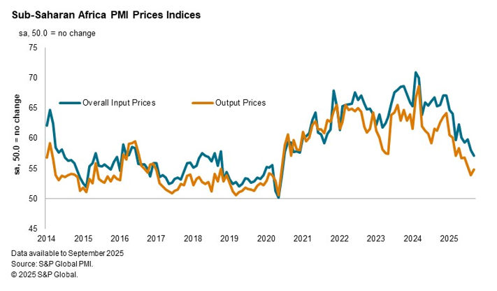 Currency appreciation has contributed to a sustained easing of inflationary pressures in the sub-Saharan Africa business sector. PMI data showed that overall input costs increased at the slowest pace since the COVID-19 pandemic in September. While selling prices rose at a slightly faster pace than in August, here too the pace of inflation was among the weakest in the past five years.