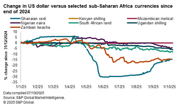 In particular, the Ghanaian cedi and Zambian kwacha have each appreciated by 15% against the US dollar in 2025 so far, while the South African rand and Nigerian naira have also seen gains.